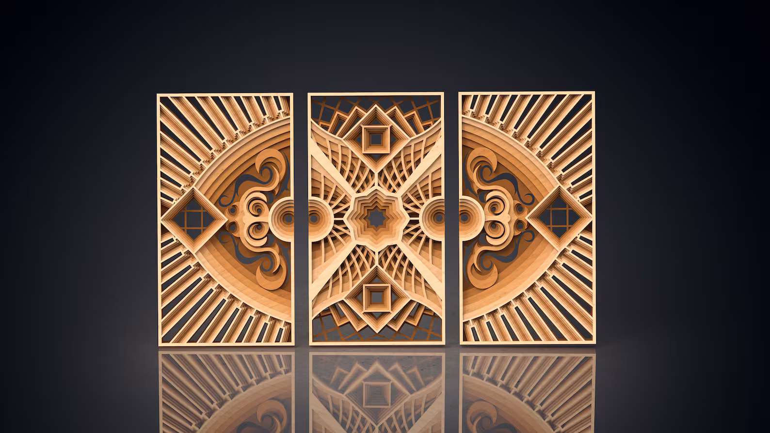 This magnificent set is meticulously constructed from six individual layers of high-quality wood, creating an incredible sense of depth and dimension. The design flows seamlessly across the three panels, featuring a grand central star medallion that recedes into a deep, cavernous core. This is flanked by powerful sunburst rays, elegant swirls, and deep, window-like geometric squares. The dramatic contrast between the warm, natural wood tones and the deep, matte black back layers makes the entire composition pop with a stunning, high-contrast 3D effect.