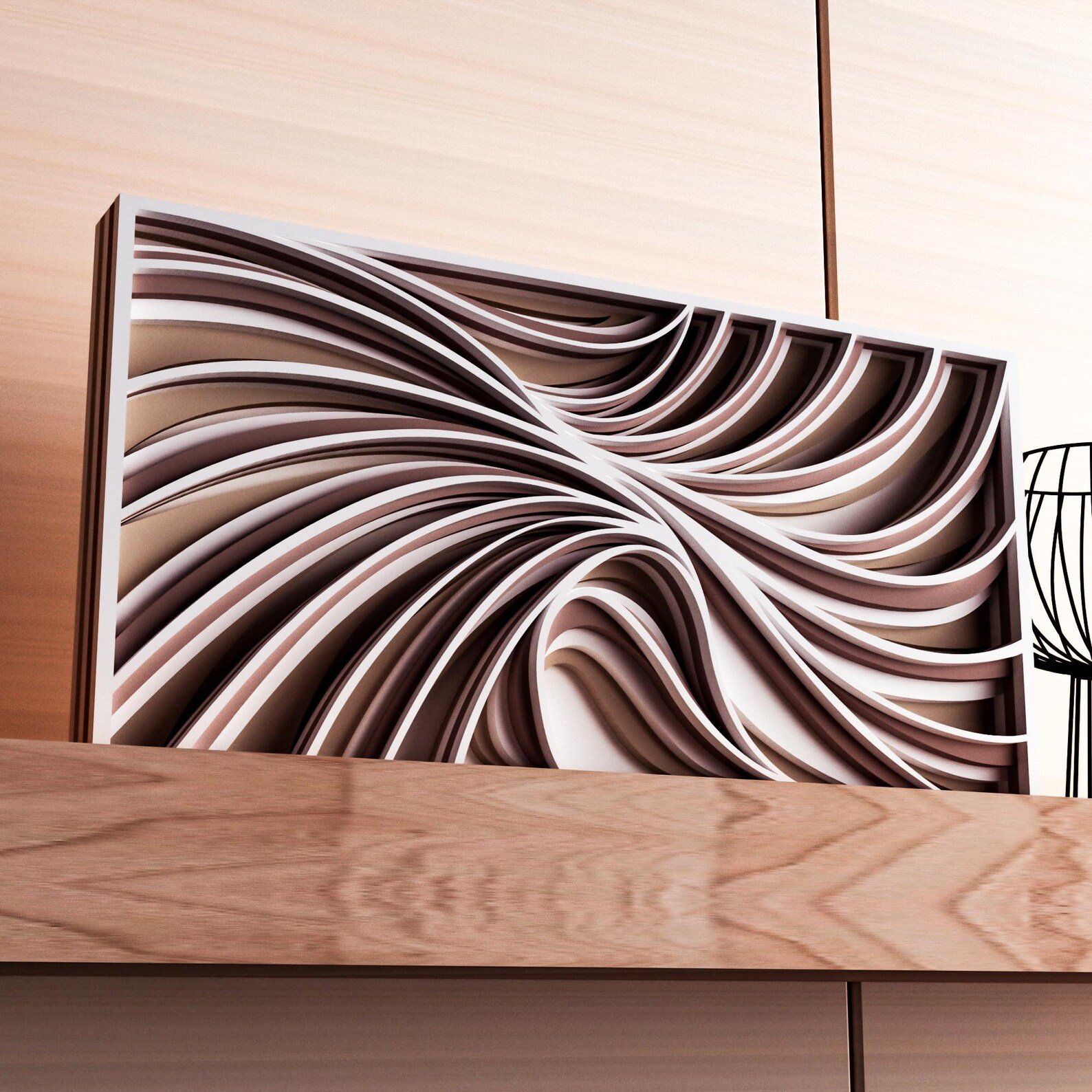 This is not a simple print; it’s a deep, multi-dimensional sculpture for your wall. Meticulously constructed from five individual layers of high-quality wood, this artwork achieves a remarkable sense of depth and motion. The design is a beautiful, wave-like composition of flowing, parametric lines that swell and recede with incredible grace. The elegant, monochromatic palette of warm sandy beige and soft white tones creates a soothing and organic visual experience, emphasizing the stunning interplay of light and shadow across its undulating form.