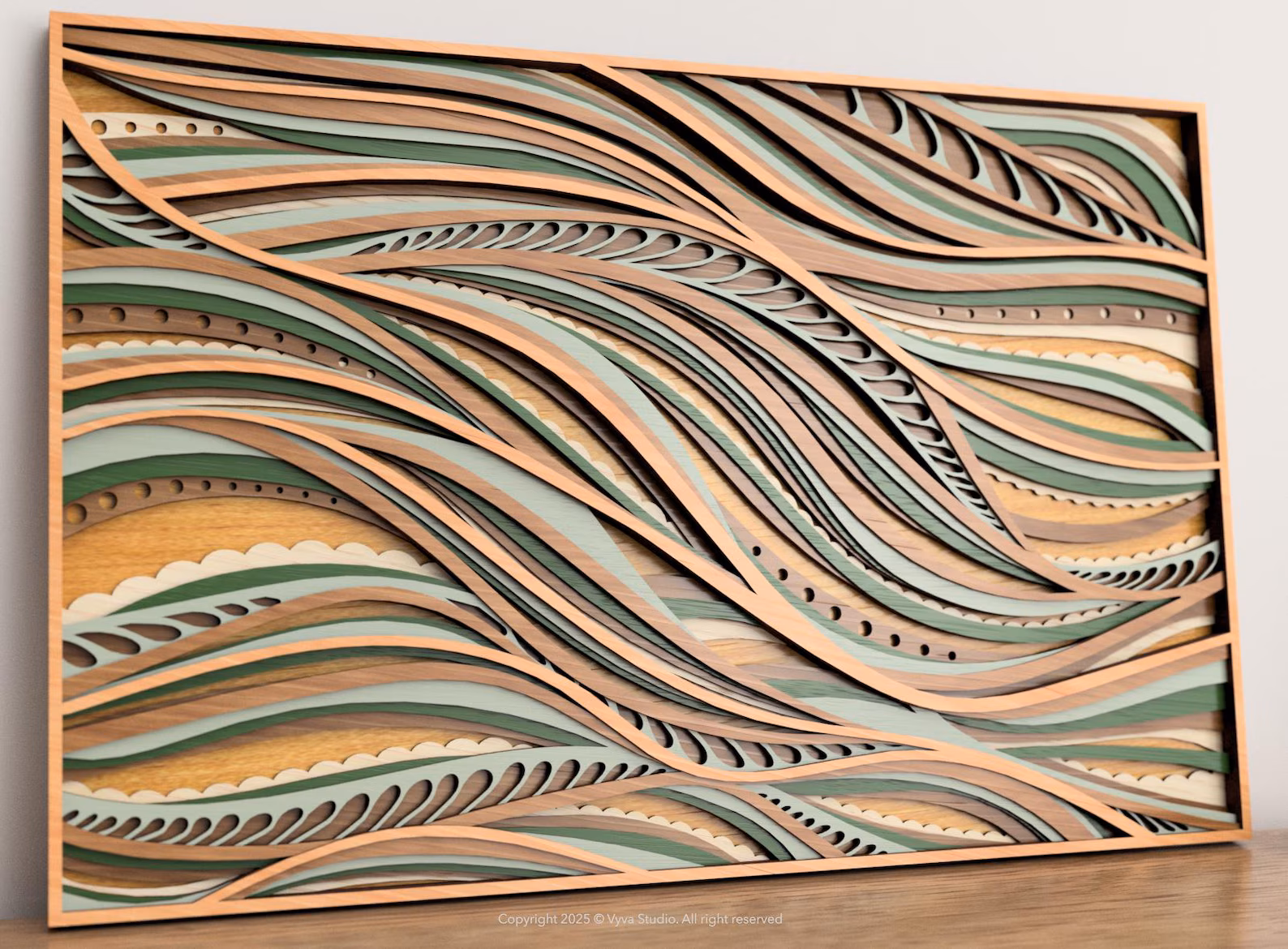 Meticulously constructed from many layers of high-quality wood, this artwork achieves a remarkable sense of depth and motion. The design is a beautiful composition of flowing, wavy lines, each layer a different color and texture. The elegant palette of soft sage green, warm terracotta, and rich olive is beautifully balanced against the natural wood grain, creating a soothing and organic visual experience. Intricate cutout details within some of the “waves” add another layer of delicate complexity.