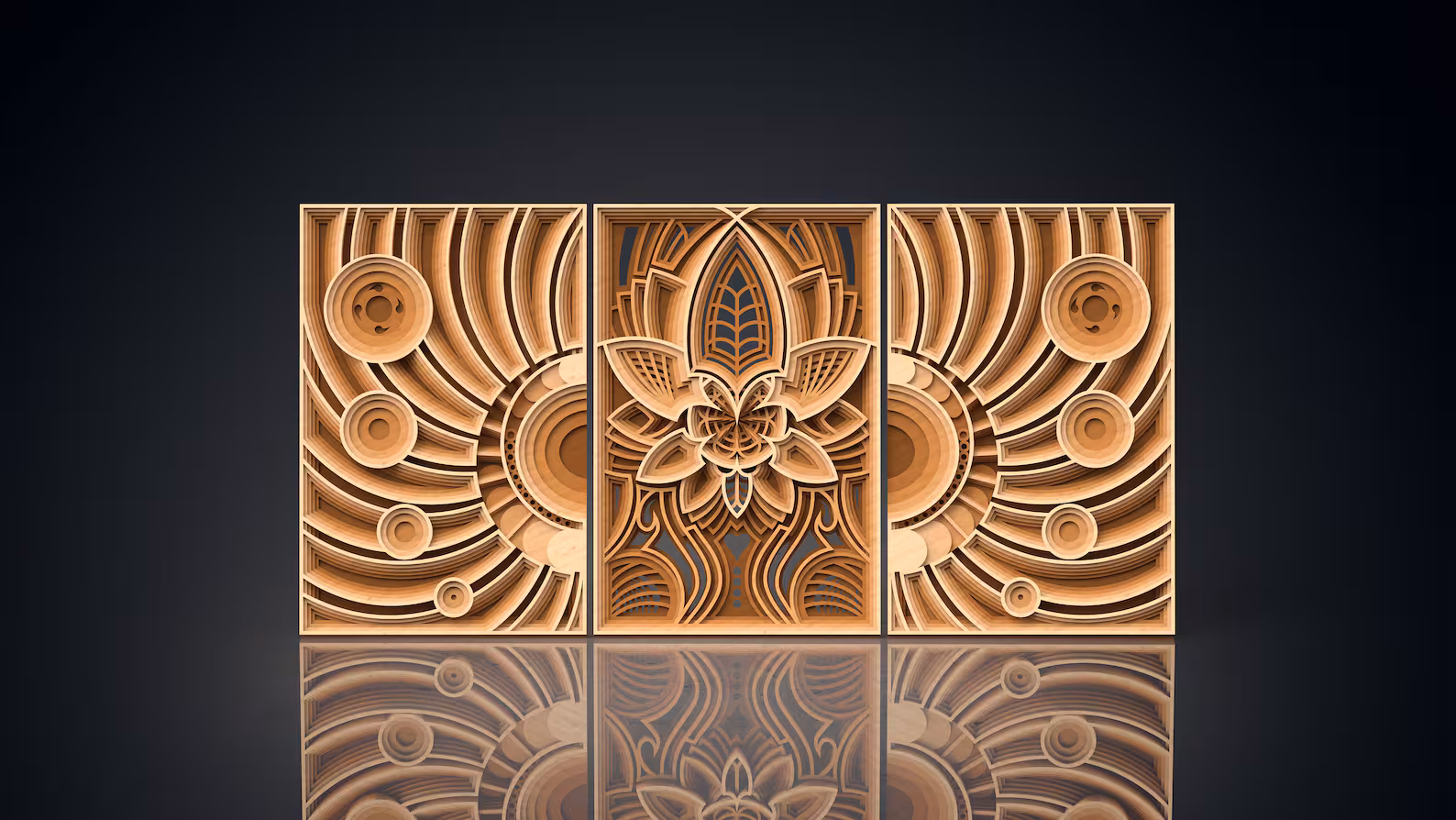 Meticulously constructed from an incredible twelve individual layers of high-quality wood, this artwork achieves a spectacular topographic effect. The central panel features a magnificent, stylized lotus flower, its petals intricately detailed and framed in a grand, architectural arch. Flanking this serene bloom are two panels featuring a mesmerizing display of deep, radiating concentric waves, like ripples echoing from the central flower’s energy. The beautiful gradient of natural wood tones enhances the incredible depth, creating a dynamic and ever-changing play of light and shadow.